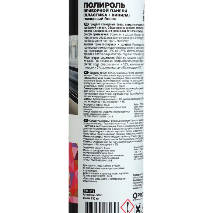 Придает глянцевый блеск, прекрасно очищает и обновляет внешний вид приборной панели. Эффективное средство для очистки и полировки приборной панели, пластиковых и резиновых деталей автомобиля.