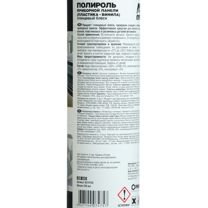 Прекрасно очищает и обновляет внешний вид приборной панели, придает глянцевый эффект. Эффективное средство для очистки и полировки приборной панели, пластиковых и резиновых деталей автомобиля.