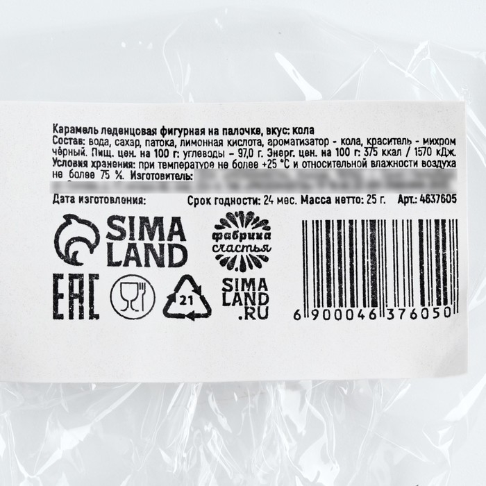 Состав: вода, сахар, патока, лимонная кислота, ароматизатор – кола, краситель - михром чёрный.