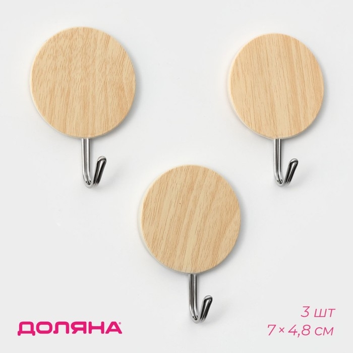 Крючки самоклеящиеся Доляна «Деревянные круги», 3 шт, цвет коричневый