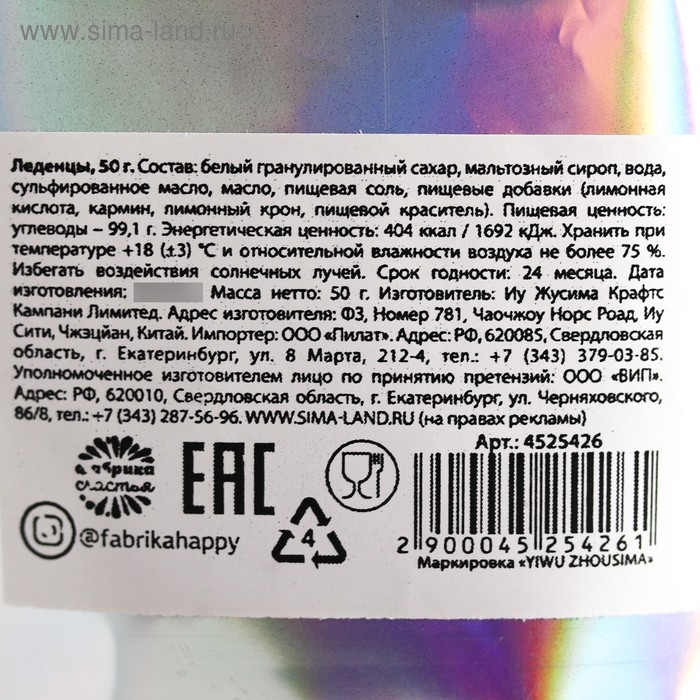Состав: белый гранулированный сахар, мальтозный сироп, вода, сульфированное масло, пищевая соль, пищевые добавки (лимонная кислота, кармин, лимонный крон, пищевой краситель).