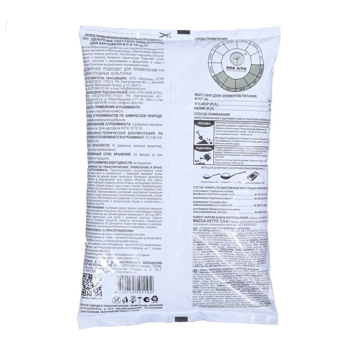 Смесевое минеральное,высокоэффективное для основного внесения и подкормки картофеля в период вегетации .Обеспечивает питание растений , способствует хорошему плодоношению и приросту биомассы корнеплодов. Повышает устойчивость растений к заболеваниям и вредителям , а также к неблагоприятным воздействиям окружающей среды. Массовая доля питательных веществ : азот -10%,фосфор - 12%,калий -14%.