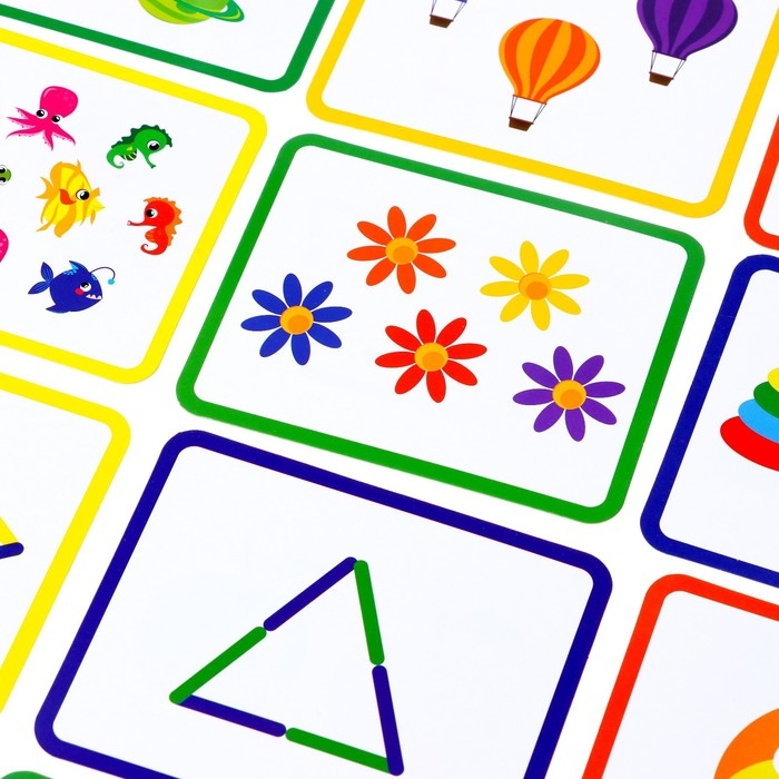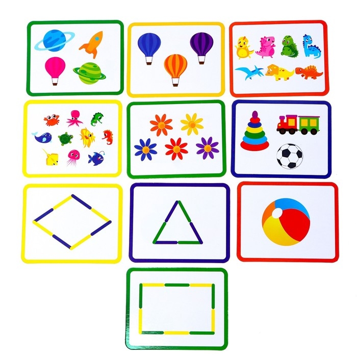 - Выбирайте карточку и называйте вслух изображённую на ней геометрическую фигуру, цвета палочек, количество животных, фруктов и других предметов.