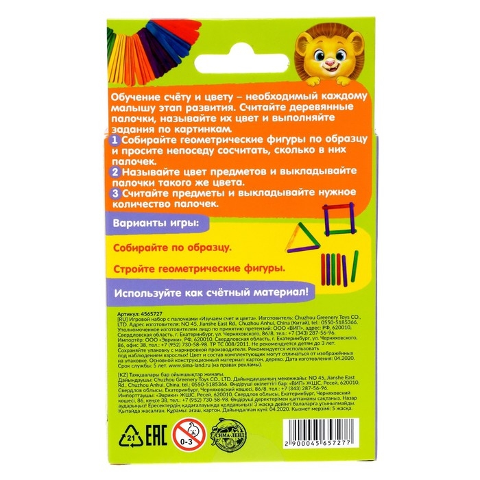 Обучающий набор «Изучаем счёт и цвета» подходит для малышей от 3 лет. Он включает деревянные палочки и карточки-схемы. Палочки выполнены из натурального дерева, приятны на ощупь и абсолютно безопасны для ребёнка.