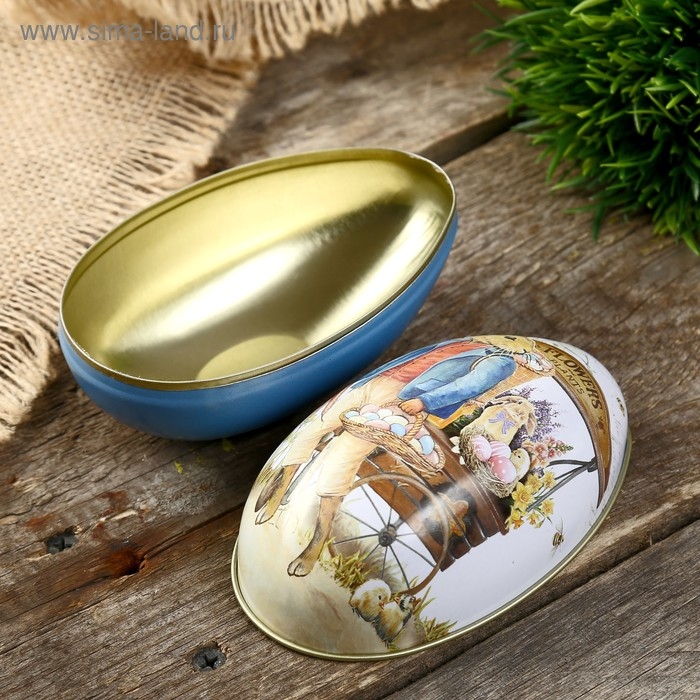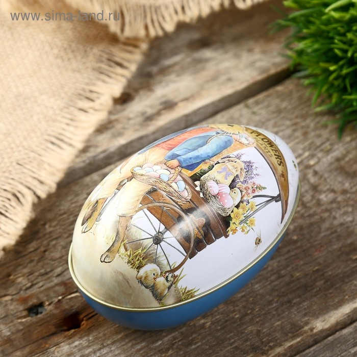 Шкатулка металл яйцо "Заяц с корзиной крашенных яиц" 11х6,5х7 см