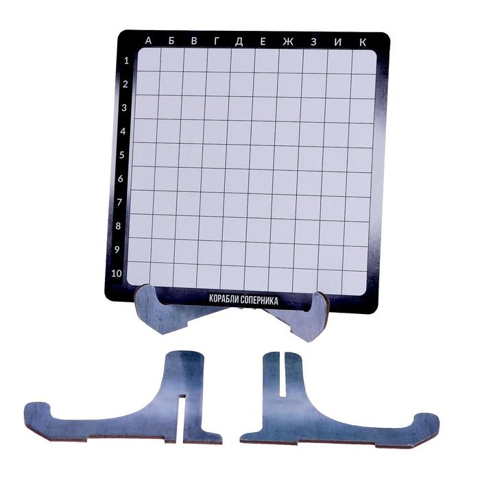 Корабли выделяются чёрным маркером на поле с подставкой. Каждый из игроков предполагает координаты их нахождения у соперника. При успешном попадании на карточке необходимо отмечать свою маленькую победу жетоном, а при поражении – крестиком красным маркером.