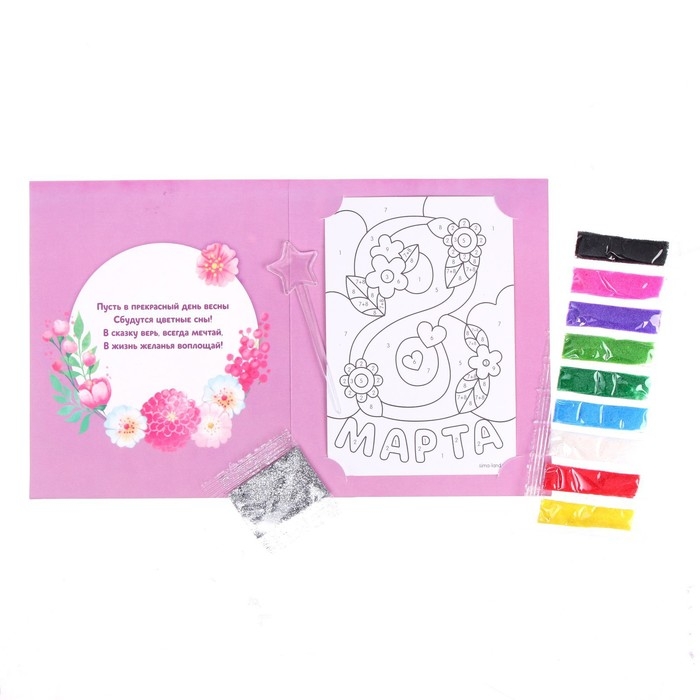Создание фресок — увлекательный вид творчества, который понравится каждому ребёнку. Клеевая основа защищена специальным слоем бумаги, куда нанесены прорезные контуры. Каждый цвет находится в своей зоне: отделяйте верхний слой с помощью стеки, оформляйте элементы песком и добавляйте блёстки согласно инструкции из набора.
