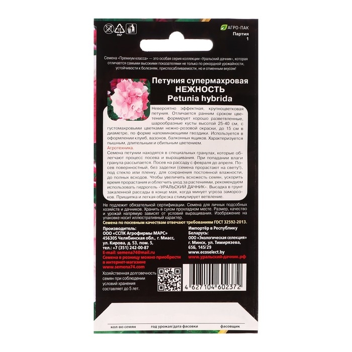 Семена петунии находятся в специальных гранулах, которые облегчают процесс посева и выращивания. При попадании влаги гранула рассыпается. Посев на рассаду с февраля до апреля. Посев поверхностный, без заделки (семена прорастают на свету!), под стекло или пленку, для сохранения постоянной влажности, до полных всходов. Чтобы увеличить всхожесть семян, ускорить время прорастания и облегчить уход за растениями, рекомендуем использовать гидрогель «УРАЛЬСКИЙ ДАЧНИК». Высадка в грунт закаленной рассады в конце мая, когда минует угроза заморозков. Прищипка и легкая обрезка стимулирует ветвление.