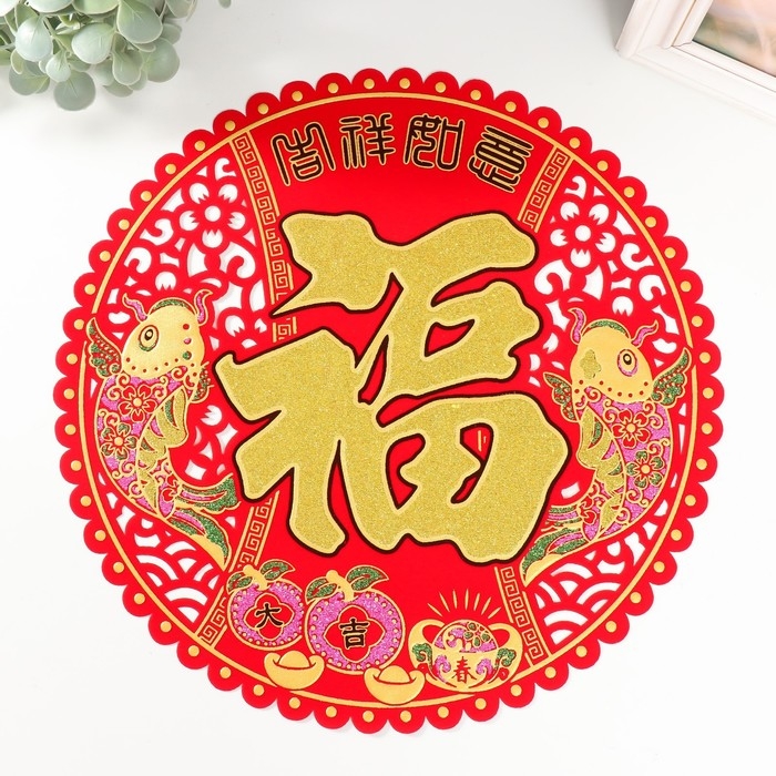 Салфетка денежная 34х34 см круглая "Два карпа - иероглиф Счастье" блёстки