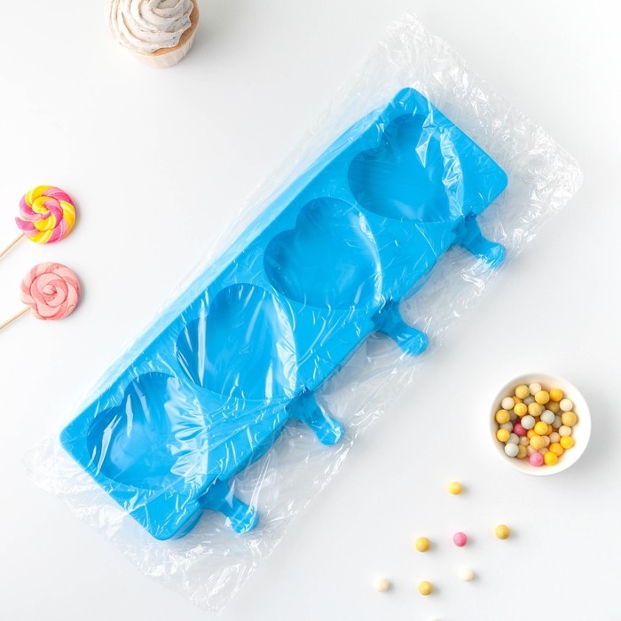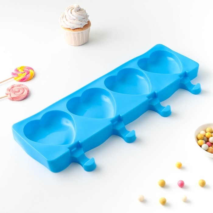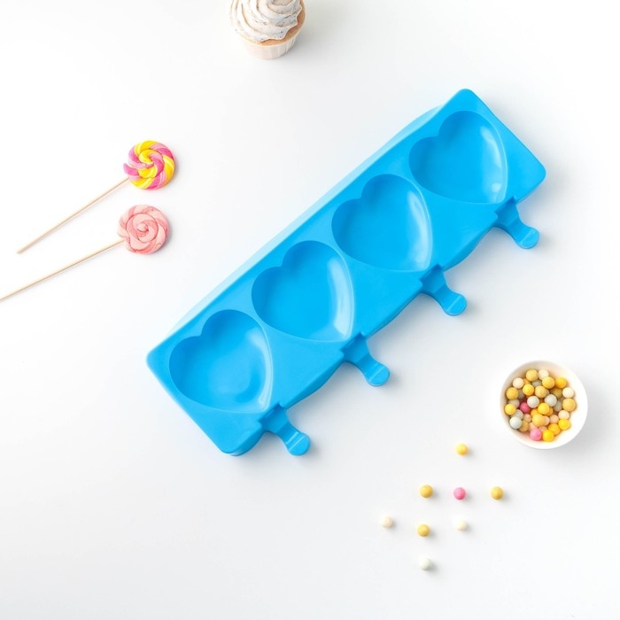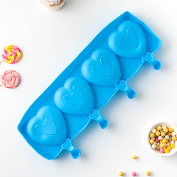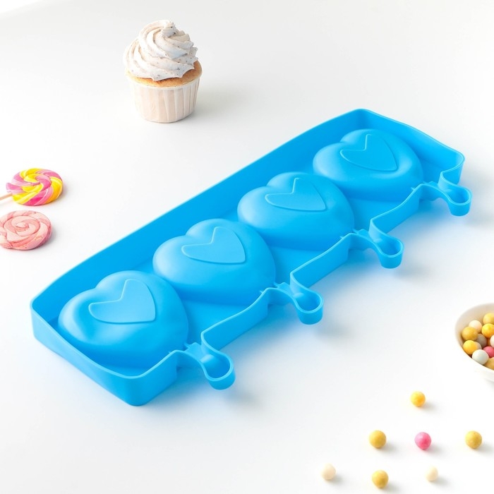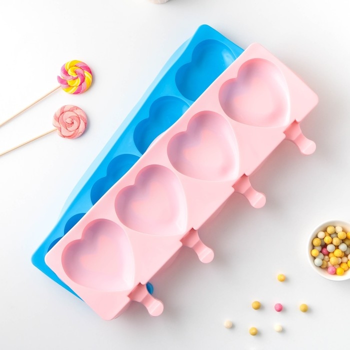 Форма для мороженого «Сердца», силикон, 37×15×2,5 см, 4 ячейки (9,2×8,4 см), цвет МИКС