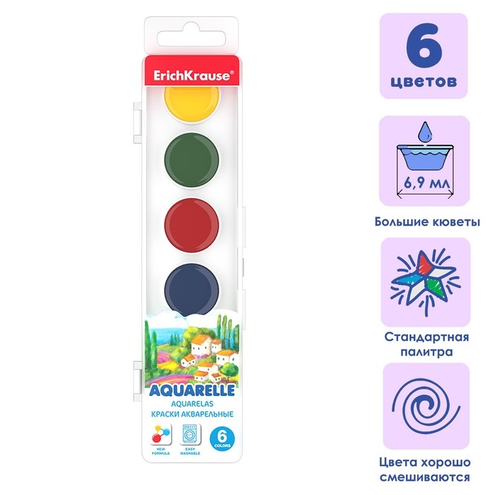 Акварель 6 цветов, ErichKrause Standard, без кисти, пластиковая коробка, европодвес