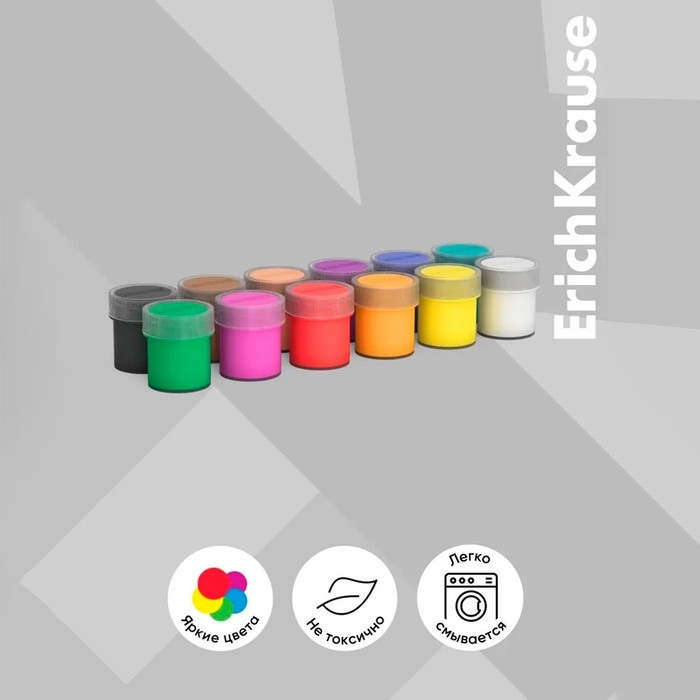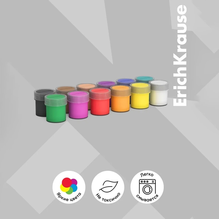 Безопасная гуашь ErichKrause® на водной основе, легко смывается с рук и отстирывается с большинства видов ткани и бытовых поверхностей, она не токсична, изготавливается из экологичных материалов.