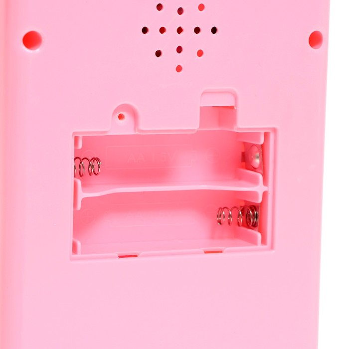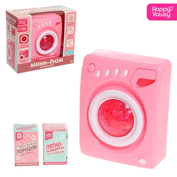 Игрушка работает почти как настоящий прибор: есть отсек для порошка, барабан крутится и издаёт звуки, а лампочка горит во время «стирки». Для игрушки необходимо 3 батарейки типа AA.