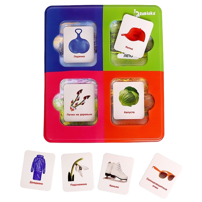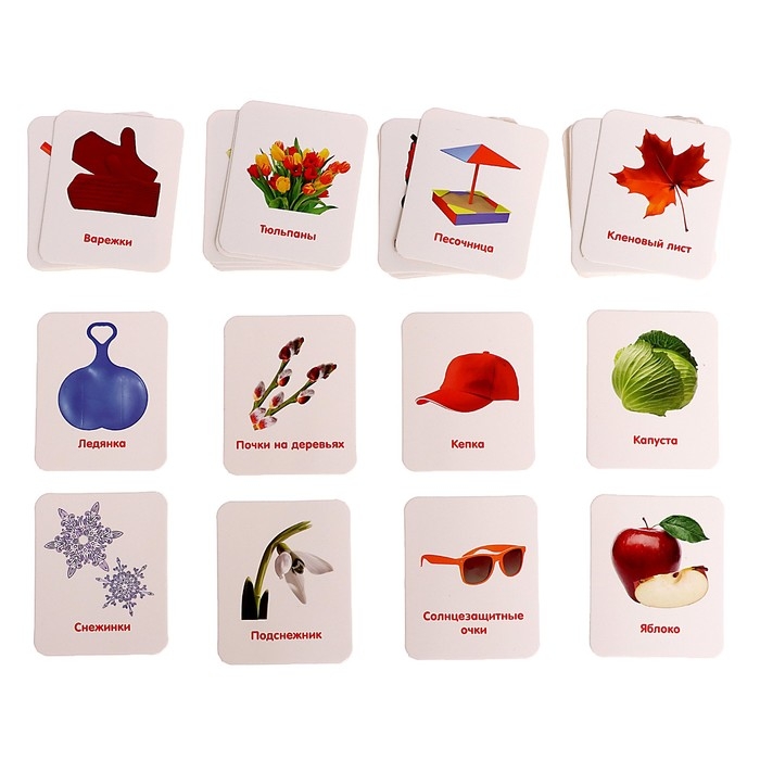 - Доставайте по одной карточке и называйте изображённый на ней предмет и время года, к которому он относится.