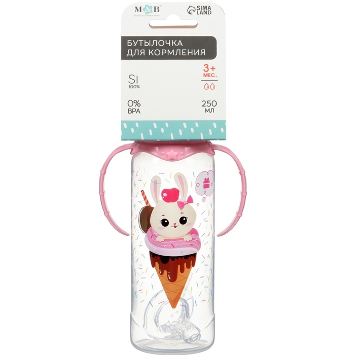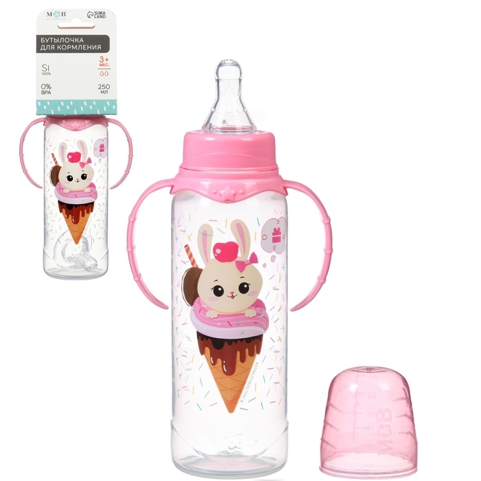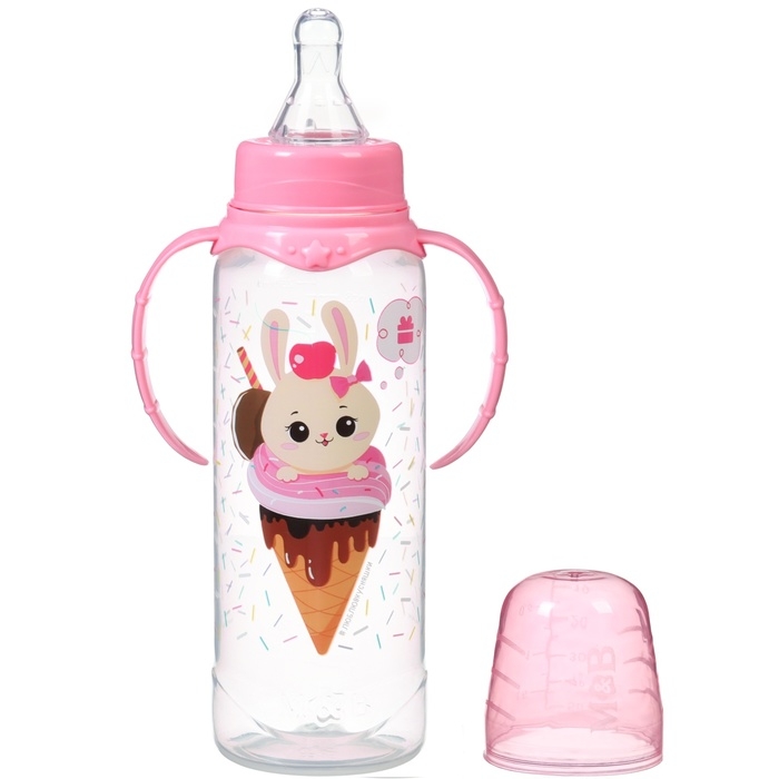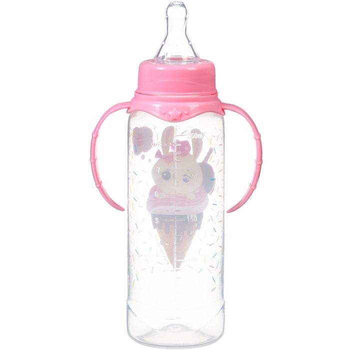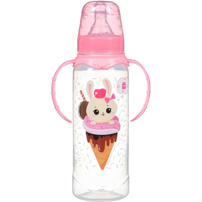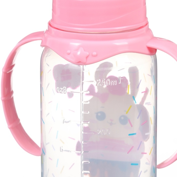 Бутылочка для кормления «Зайка, пончик», классическое горло, 250мл., от 3 мес., цилиндр, с ручками