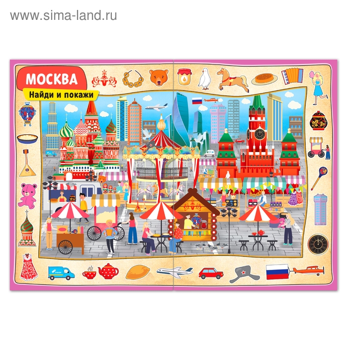 На каждой странице представлены яркие картинки с изображениями карты нашей страны, достопримечательностей и других предметов.