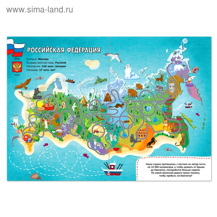 Ребёнок познакомится с символами нашей страны и животными, а также узнает, в какой местности они обитают. А ещё совершит путешествие по Москве и Санкт-Петербургу!