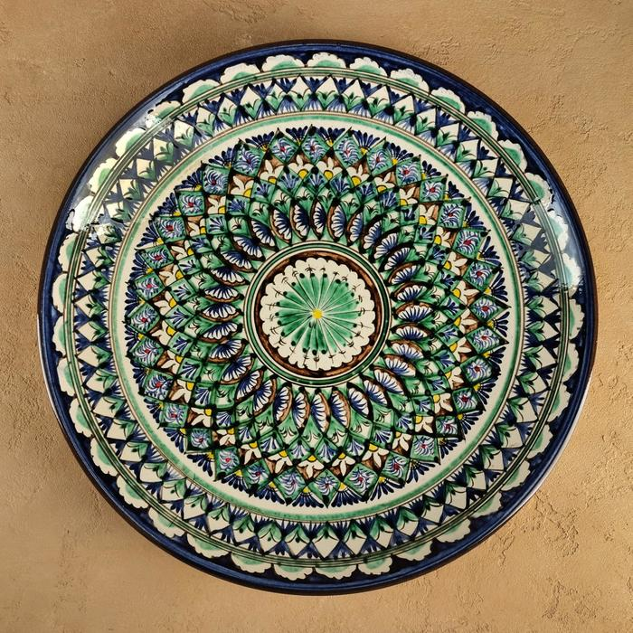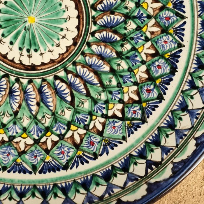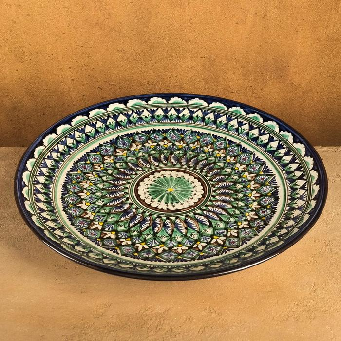 Ляган круглый «Риштан», 36 см, зелёный, орнамент бело-синий