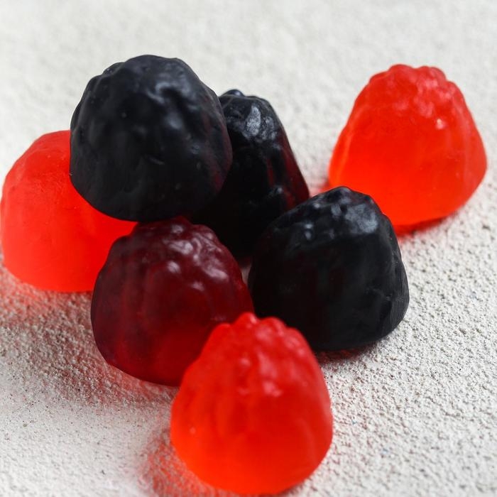 Состав: глюкозный сироп, сахар, агент желирующий – желатин, регулятор кислотности – лимонная кислота (Е330), ароматизаторы: «Малина», «Ежевика», «Барбарис», красители пищевые: кармуазин (Е122), понсо 4R (Е124), индигокармин (Е132), черный блестящий PN (Е151), глазирователь: растительное масло, воск карнаубский.