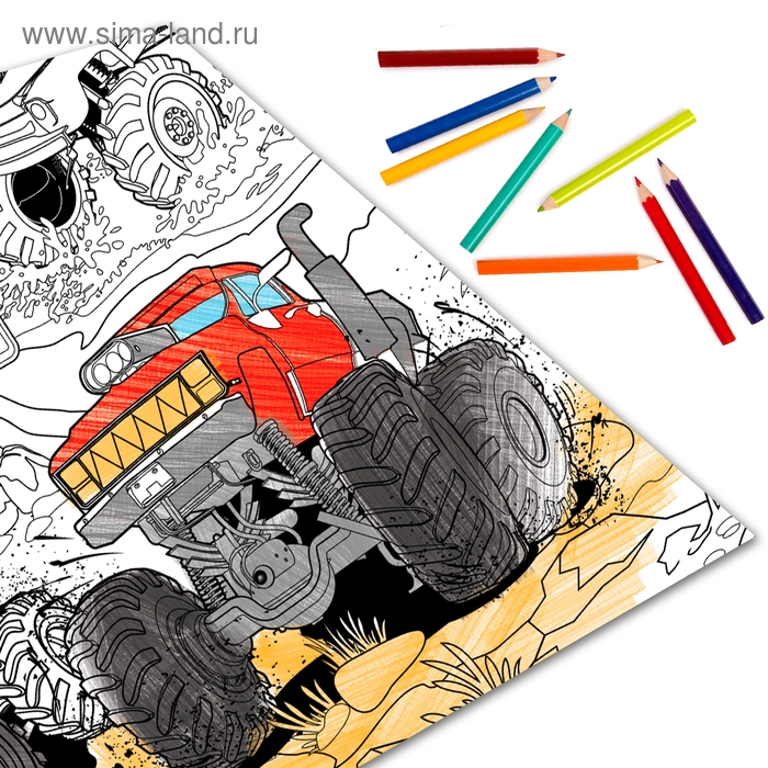 Раскраска гигант «Монстр-ралли» — это отличная возможность для детей весело провести время, развивая моторику и фантазию.