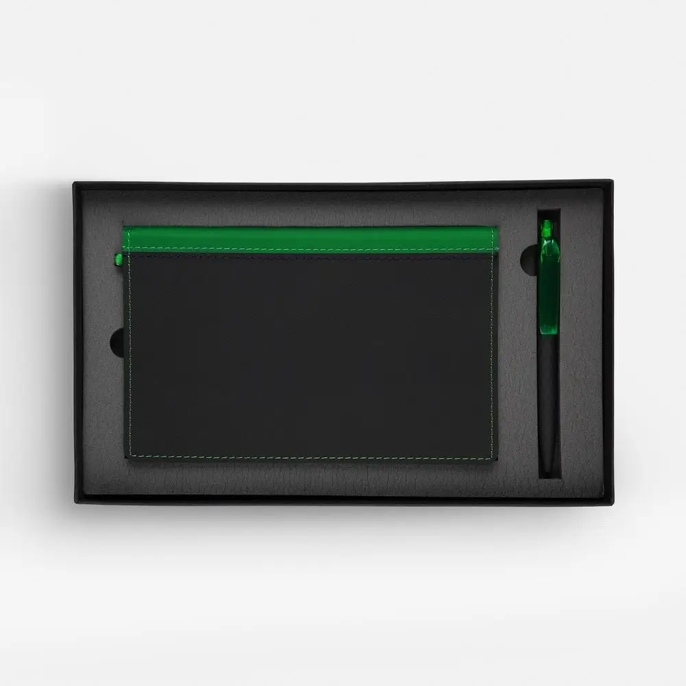 Стильный двухцветный ежедневник с гибкой обложкой и цветным обрезом, а также ручка в тон.