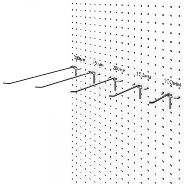 Крючок подходит для панелей толщиной от 0,6 до 7 мм с шагом перфорации 25 мм.