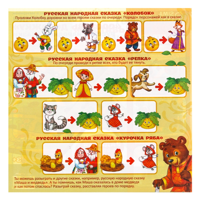 Суть игры:во время чтения сказки (можно и по памяти) соединить героев в нужном порядке. Вы можете с малышом сами выбрать, какую сказку вы будете разыгрывать (они обозначены на обороте): "Колобок", "Репка", "Курочка Ряба". Также предлагаем разыгрывать другие сказки и собственные сюжеты.