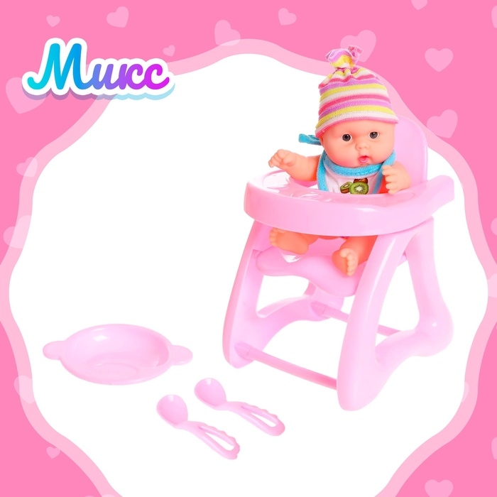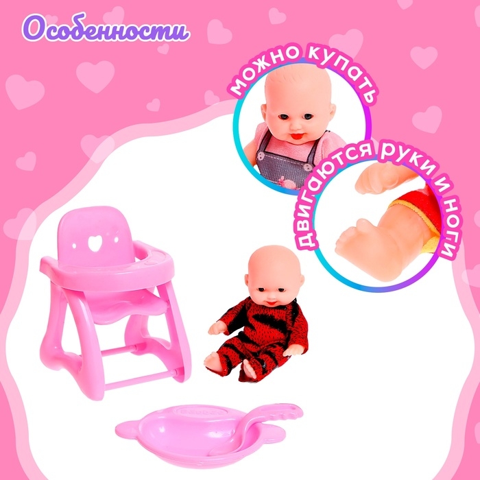 В коллекции представлены пупсы с разными аксессуарами: коляска, стульчик для кормления, 2 ложечки, тарелочка, бутылочка. Соберите все милые наборы!