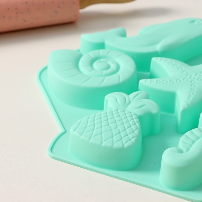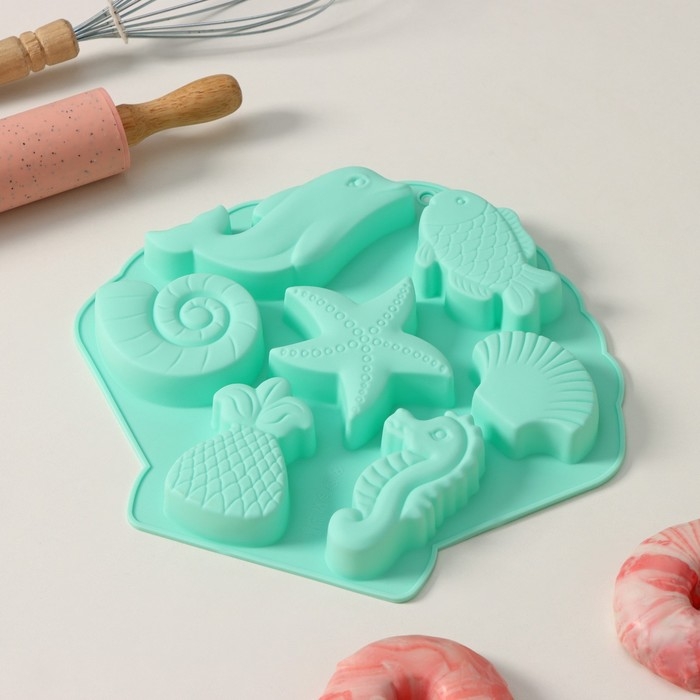 Форма для выпечки Доляна «Морские обитатели», силикон, 26×24×2,5 см, 7 ячеек, цвет бирюзовый