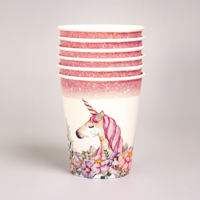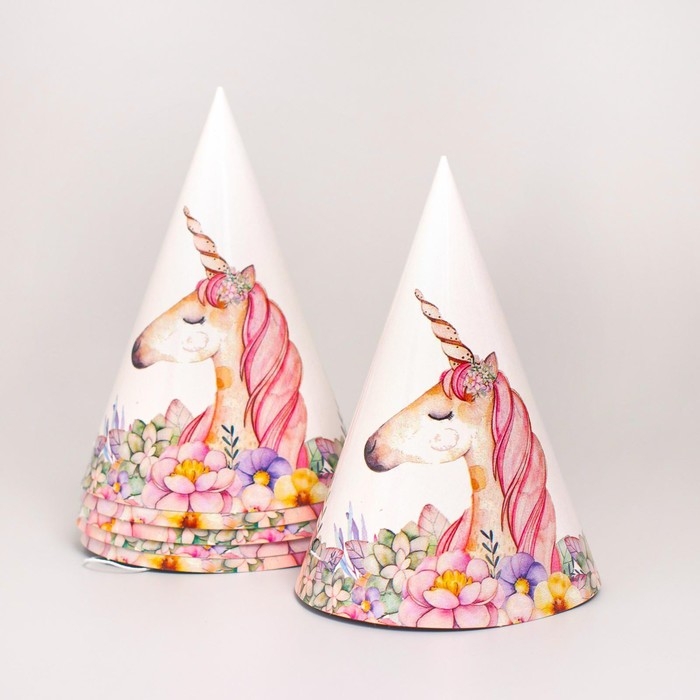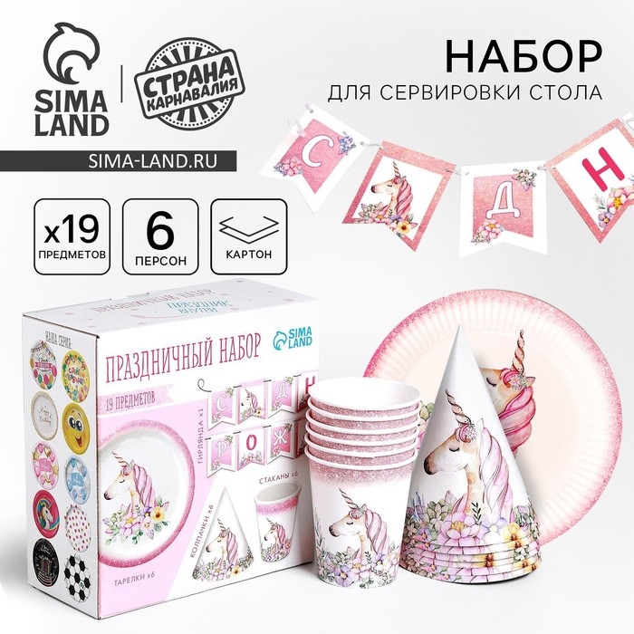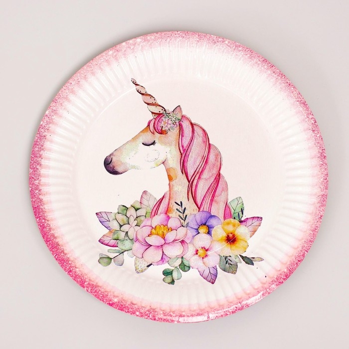 Набор бумажной посуды одноразовый Единорог с цветами», 6 тарелок, 1 гирлянда, 6 стаканов, 6 колпаков