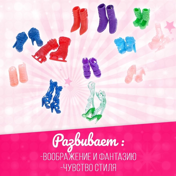 Порадуйте юную модницу и её любимых кукол! Набор из 30 пар обуви позволит создать бесконечное множество образов для самых разных случаев. В комплекте вы найдёте классические туфли-лодочки для элегантных выходов, удобные босоножки для тёплых дней, сапожки для осени и даже стильные коньки для зимних забав.