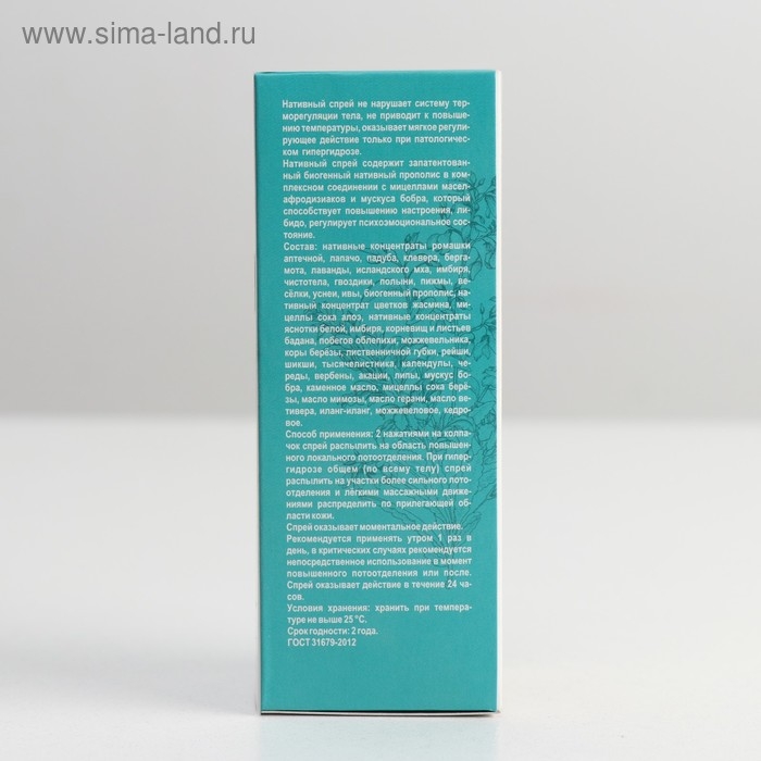 Нативный спрей не содержит гормонов, синтетических, лекарственных, психотропных, генномодифицированных веществ и консервантов, не содержит алюмосиликатов, гипоаллергенен, не влияет на кровообращение, не закупоривает поры, способствует восстановлению естественных обменных процессов верхнего слоя кожи, нижнего эпидермиса, сальных желез, оказывает регулирующее действие на функции и состояние потовых желез, прилегающие сосуды и области кожи и соединительной ткани, способствует: