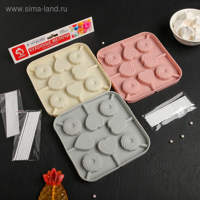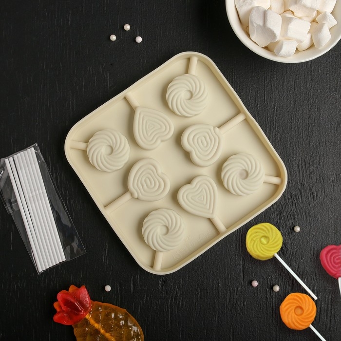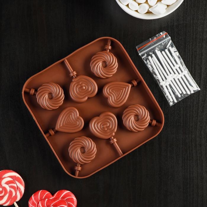 Форма для леденцов Доляна «Свидание», силикон, 14,5×14,5×1,5 см, 8 ячеек (3,5×3,5 см), с палочками, цвет МИКС