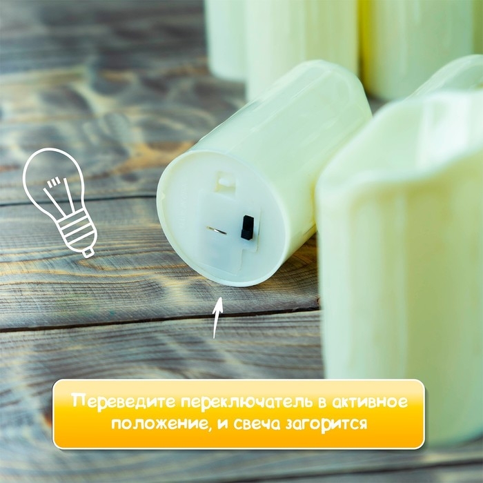Переведите переключатель в активное положение, и свеча загорится ярким мерцающим светом. Сделайте незабываемый сюрприз дорогому человеку: расставьте такие огоньки по комнате.