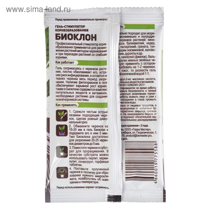 Профессиональный стимулятор корнеобразования применяется для размножения растений методом черенкования и при пересадке растений со слабыми корнями. Гель соприкасаясь с черенком растения, плотно его обволакивает, устраняя риск инфицирования, и остается на тканях черенка весь период укоренения. Наличие фитогормонов в геле обеспечивает мощный рост корней, также в Биоклоне содержится комплекс питательных веществ и витаминов, необходимых растению для создания новой корневой системы.
