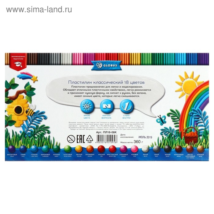 Пластилин GLOBUS "Классический", 18 цветов, 360 г, со стеком