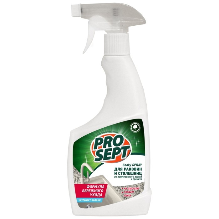 Cпрей для мытья столешниц и раковин из искусственного камня и гранита Prosept – удаляет известковый налет, пыль, жировые и органические загрязнения обеспечивая бережный уход. Придает блеск и свежесть столешницам, раковинам, подоконникам и другим поверхностям из искусственного камня. Действует мягко, не повреждая самые капризные влагостойкие глянцевые и матовые поверхности.