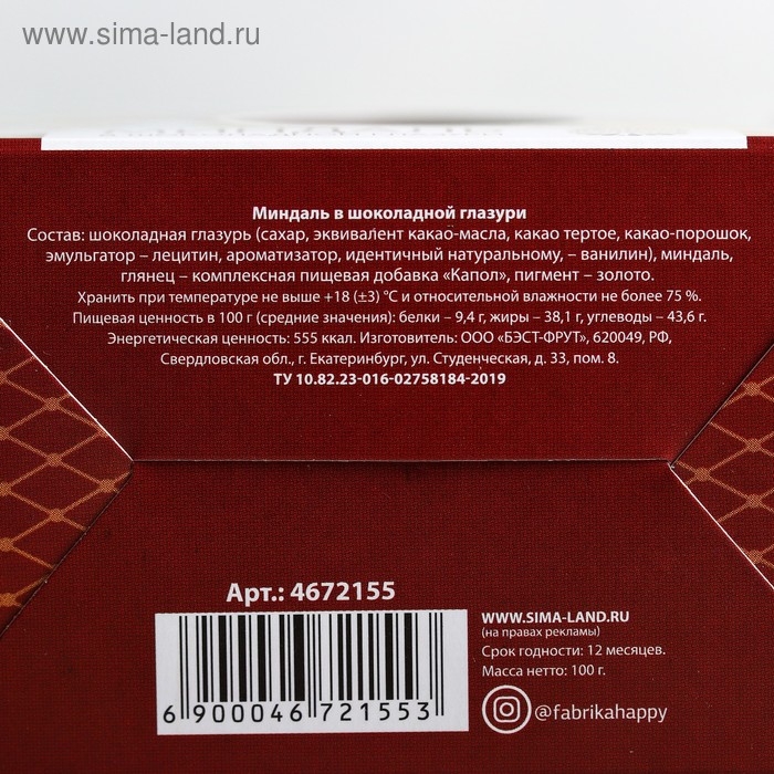 Состав: шоколадная глазурь (сахар, эквивалент какао-масла, какао тертое, какао-порошок, эмульгатор – лецитин, ароматизатор, идентичный натуральному, – ванилин), миндаль, глянец – комплексная пищевая добавка «Капол», пигмент – золото.