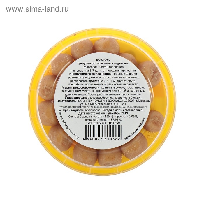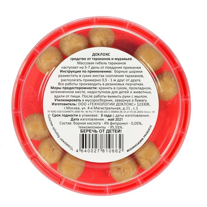 Дохлокс - средство от тараканов и муравьев. Массовая гибель тараканов наступает на 5-7 день от поедания приманки. Самый эффективный вариант – скатать небольшие ядовитые шарики. Тараканы собирают крошки еды, поэтому маленькие шарики с борной кислотой однозначно привлекут их внимание.Инструкция по применению: борные шарики разместить в сухих местах скопления тараканов, располагать примерно 0,5 - 1м друг от друга. Все работы производить в резиновых перчатках.Состав: борная кислота 12%, фипронил - 0,05%, техкомпоненты 87,95%.Меры предосторожности: хранить в сухом, прохладном, затемненном месте, недоступном для детей и животных, вдали от пищи. После работы вымыть руки с мылом. Утилизировать в мусоросборник, завернув в бумагу.