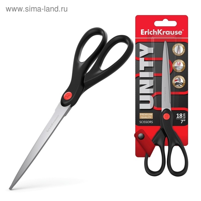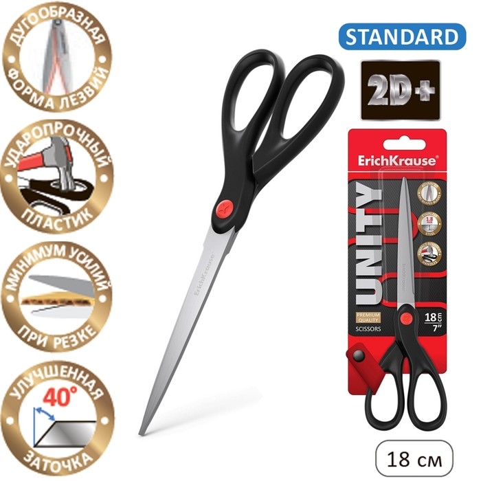 Ножницы ErichKrause Unity, 18 см, дугообразная форма, двойная заточка лезвий, ударопрочный пластик, блистер, чёрные