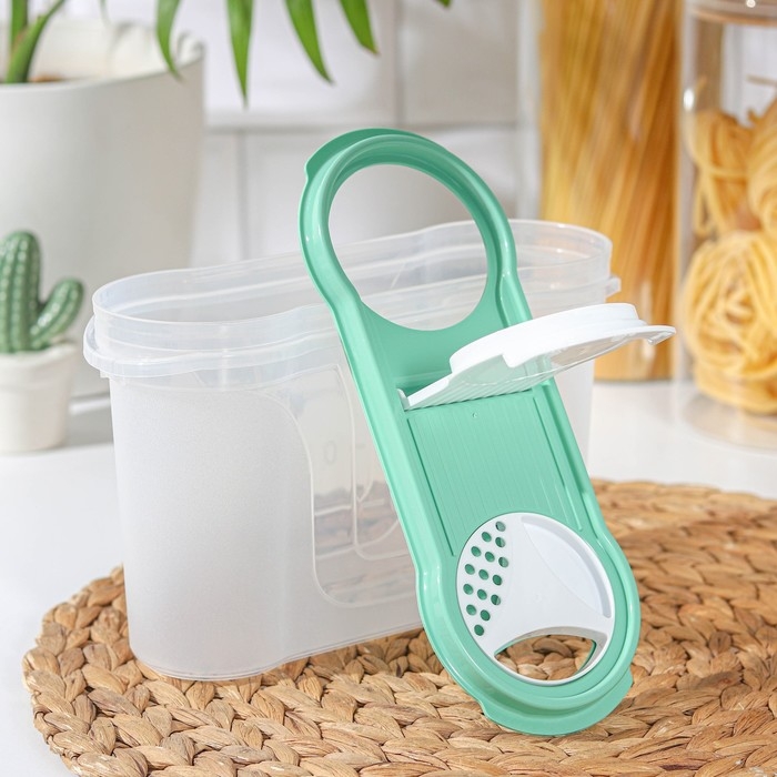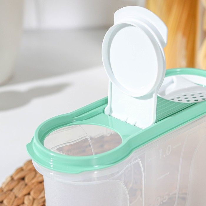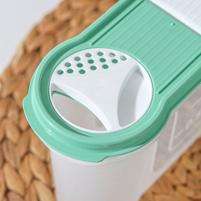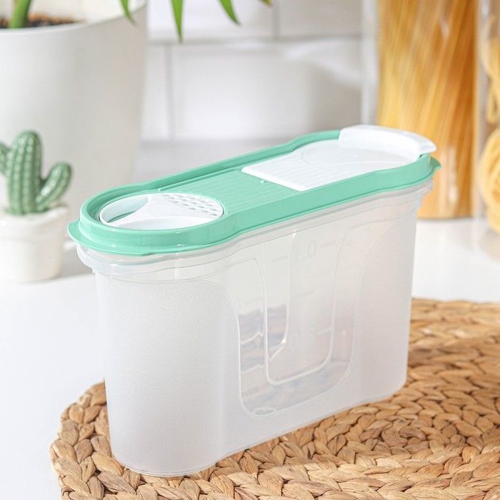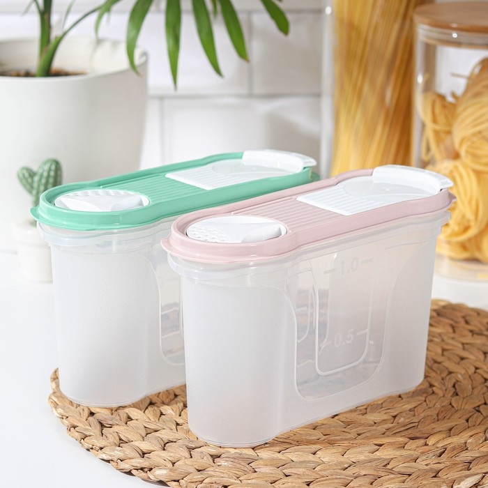 Банка для сыпучих продуктов изготовлена из пластика. Имеет плотно закрывающуюся крышку, которая защищает еду от влаги и посторонних запахов. В ёмкости удобно хранить крупы, специи, макаронные изделия, сахар, муку и бобовые.