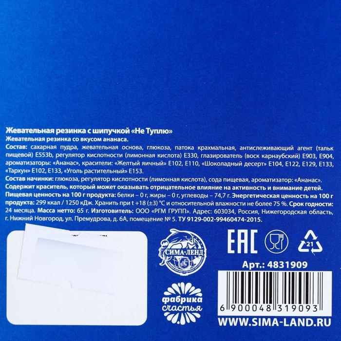 Состав: сахарная пудра, жевательная основа, глюкоза, патока крахмальная, антислеживающий агент (тальк пищевой) Е553b, регулятор кислотности (лимонная кислота) Е330, глазирователь (воск карнаубский) Е903, Е904, ароматизаторы: «Ананас», красители: «Желтый яичный» Е102, Е110, «Шоколадный десерт» Е104, Е122, Е129, Е133, «Тархун» Е102, Е133, «Уголь растительный» Е153. Состав начинки: глюкоза, регулятор кислотности (лимонная кислота), сода пищевая, ароматизатор: «Ананас». Масса нетто: 65 г. Срок годности: 24 месяца.