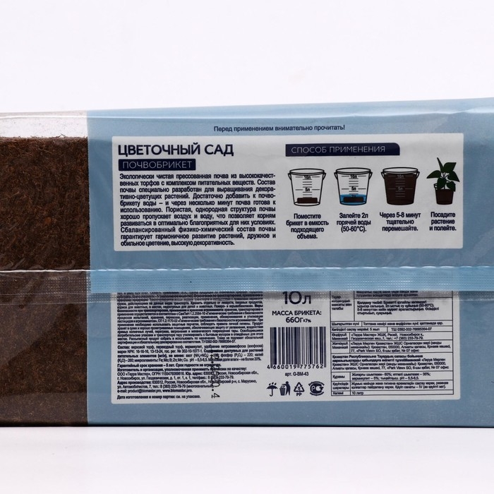Брикет разводится в 4 л теплой воды, увеличиваясь в объеме до 10 л готового грунта. pH:5,5-6,5
