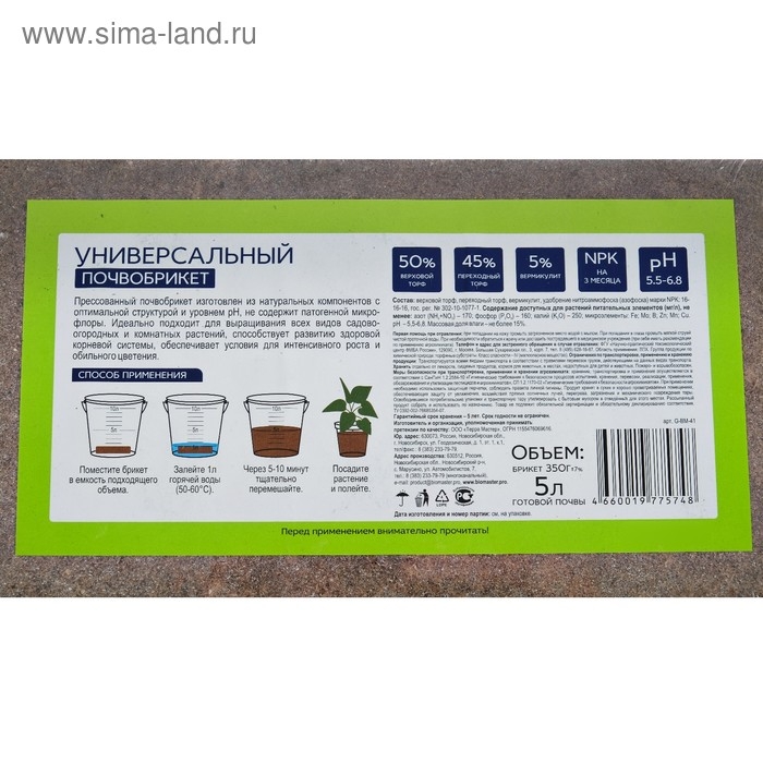Брикет разводится в 4 л теплой воды, увеличиваясь в объеме до 10 л готового грунта.