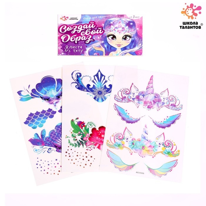 В набор входят 3 листа временных татуировок для лица.