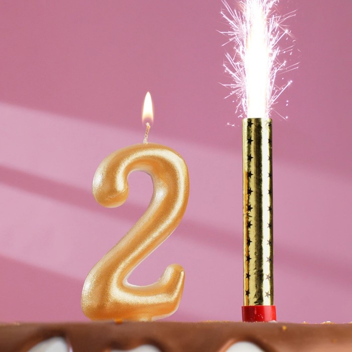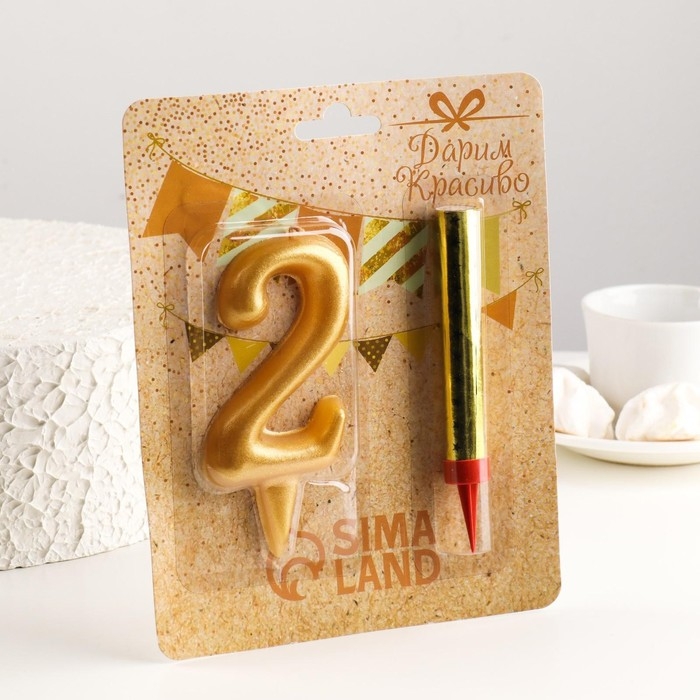 Набор Свеча для торта цифра 2 Гигант, золотая, с фонтаном, 9,5 см