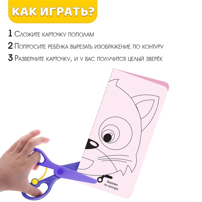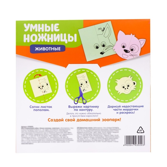 С этим набором малыш научится работать с ножницами. Он узнает, как ровно по контуру вырезать картинки из бумаги.