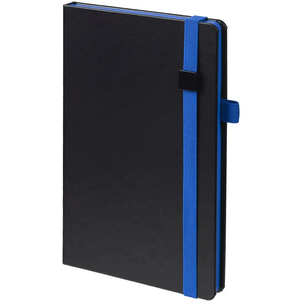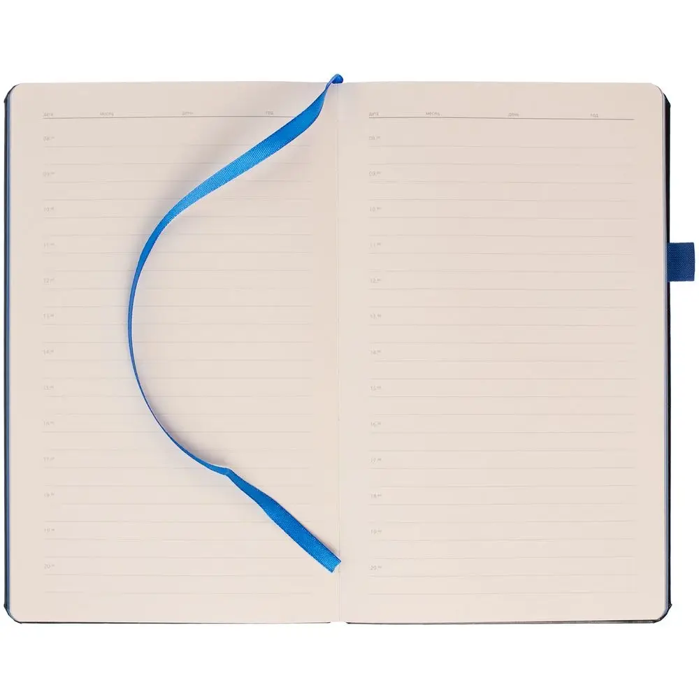 Ежедневник с полутвердой обложкой, выполнен из материала Waltz, черный АА, дополнен синей резинкой с металлическим шильдом и ляссе.