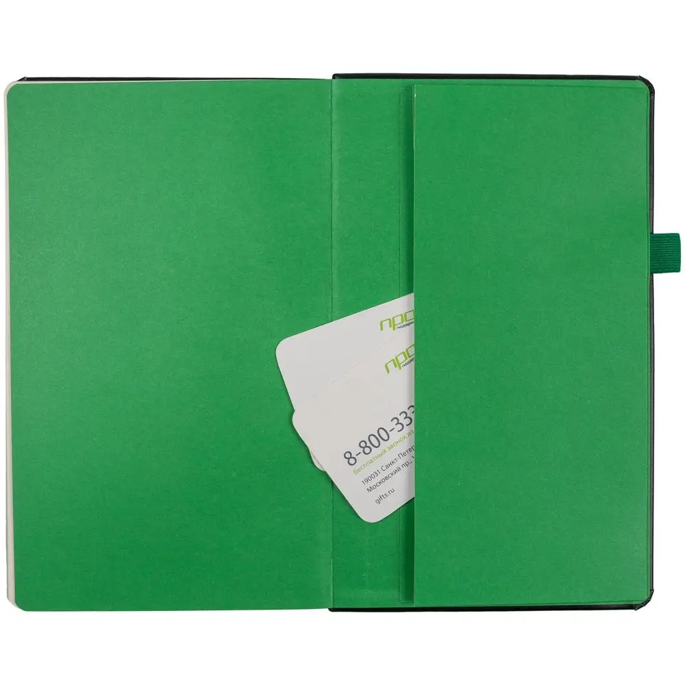 Ежедневник с полутвердой обложкой, выполнен из материала Waltz, черный АА, дополнен зеленой резинкой с металлическим шильдом и ляссе.