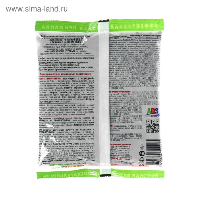 Эффективная, готовая к применению приманка в форме экструдированных гранул для борьбы с медведкой, проволочником и личинкой майского жука:на овощных (картофель, томаты, огурцы, баклажаны и т.д.) ягодных (клубника, малина, крыжовник и др.) культурах, цветахА также от садовых муравьёв: на грядкахпод деревьями и кустамив теплицах и около зданийСпособ применения:Для борьбы с медведкой: приманку по 2-4 г (1 чайная ложка) раскладывают в норки и ходы медведки на глубину 3-5 см на расстоянии 0,5-0,7 м. После размещения приманки, вход уплотняют. Сухую почву смачивают водой. Первую обработку следует проводить за 5-10 дней до посева семян или посадки растений. Вторая обработка нужна в случае возобновления ходов медведки, в период размножения вредителя (май-июнь). При большом сосредоточении вредителей препарат можно применять повторно.Период защитного действия: 15-20 дней. В поражённых медведкой районах нельзя проводить подпитку растений свежим коровяком-он приведёт вредителя из всей округи. Разведённый птичий помёт, (нужно поливать землю в сухую погоду настоем куриного помёта). СОСТАВ: имидаклоприд - 5г/кг, крупяная смесь в виде гранул, сахар, растительное масло, краситель. Подробнее: https://xn--80ado1abokv5d.xn--90ais/p179535203-napoval-200gr-medvedki.html